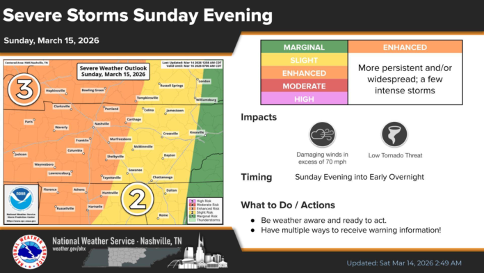 Ante este panorama, el Servicio Meteorológico ha elevado la alerta a Nivel 3 de 5 para la mayor parte de Middle Tennessee al oeste de la meseta de Cumberland, mientras que las zonas cercanas a la meseta se mantienen en Nivel 2. Tras el paso de las tormentas, se espera que el termómetro caiga bruscamente, por lo que se recomienda a la población estar preparada para un inicio de semana significativamente más frío.