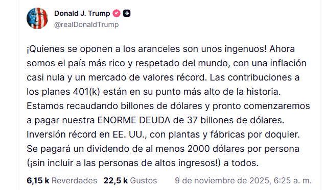 También dijo que quienes no apoyan los aranceles son «tontos»: «¡Quienes se oponen a los aranceles son unos tontos! Ahora somos el país más rico y respetado del mundo, con una inflación prácticamente nula y una bolsa de valores con precios récord», escribió Trump en una publicación de Truth Social. «Se pagará un dividendo de al menos 2000 dólares por persona (¡sin incluir a las personas de altos ingresos!) a todos», añadió el presidente.