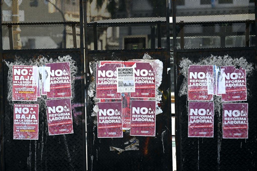 Carteles contrarios a la reforma laboral del presidente Javier Milei, pegados en una valla de seguridad frente a la sede del Congreso argentino, el 27 de febrero de 2026 en Buenos Aires