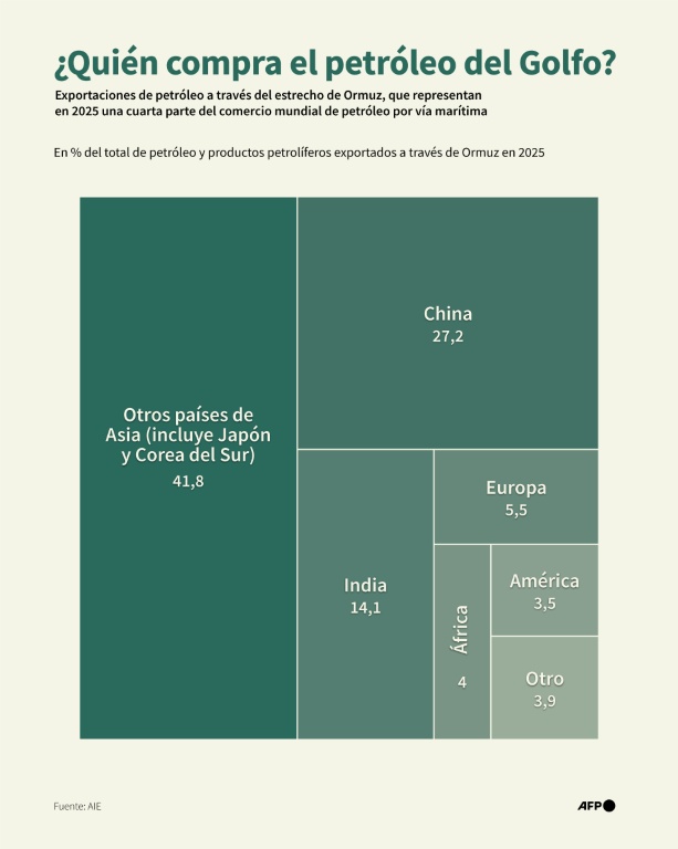 Infografía mostrando el destino de las exportaciones de petróleo y de productos petróliferos que transitaron en 2025 a través del estrecho de Ormuz