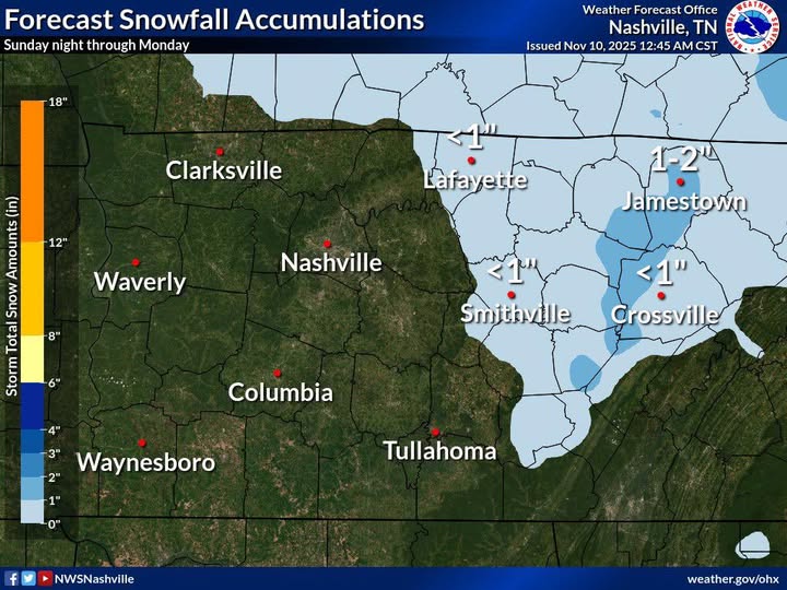 Nashville, Tennessee.- El Servicio Meteorológico mantiene vigente un aviso de clima invernal para el lunes en la mayor parte de la meseta de Cumberland y áreas adyacentes.