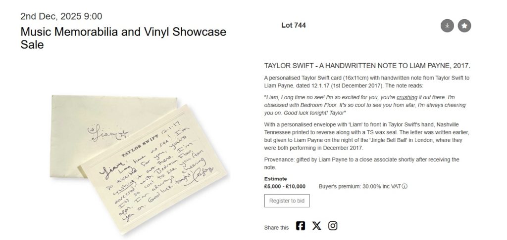 «¡Liam, cuánto tiempo sin verte! Me alegro mucho por ti, lo estás haciendo genial. Estoy obsesionada con ‘Bedroom Floor’. Es genial verte desde lejos, siempre te estoy animando. ¡Mucha suerte esta noche!”, escribió Taylor en el texto que será subastado a través de Omega Auctions.