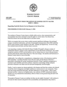 SUMNER COUNTY, TENNESSEE.- El alcalde de Sumner County, John C. Isbell, emitió un comunicado el 2 de febrero, señalando que Nashville Electric Service (NES) no brindó un servicio confiable ni información adecuada durante la tormenta de hielo Fern, dejando a muchas familias sin electricidad por largos períodos.
