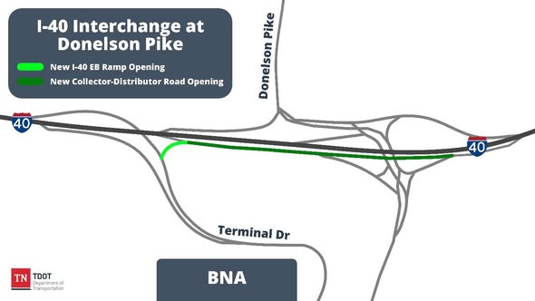 La nueva rampa forma parte del proyecto Intercambio de la I-40 en Donelson Pike, iniciado en 2022, que incluye la reubicación y reconstrucción de Donelson Pike (Ruta Estatal 255) en un moderno Intercambio de Diamante Divergente (Diverging Diamond Interchange). Los trabajos finales de pavimentación y recubrimiento se encuentran en marcha y se espera su conclusión para noviembre.