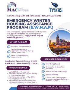 «Nuestra comunidad ha enfrentado desafíos extraordinarios a raíz de la tormenta invernal Fern. Este programa está diseñado para brindar alivio inmediato a las familias que luchan por mantener una vivienda estable», dijo Jamekia Bies, Directora Ejecutiva de la MAC. «Estamos profundamente agradecidos con los Tennessee Titans por su generosa contribución a través del Fondo Catalizador Home Field Advantage. Su apoyo nos ayudará a brindar estabilidad y esperanza a las familias durante este difícil momento».