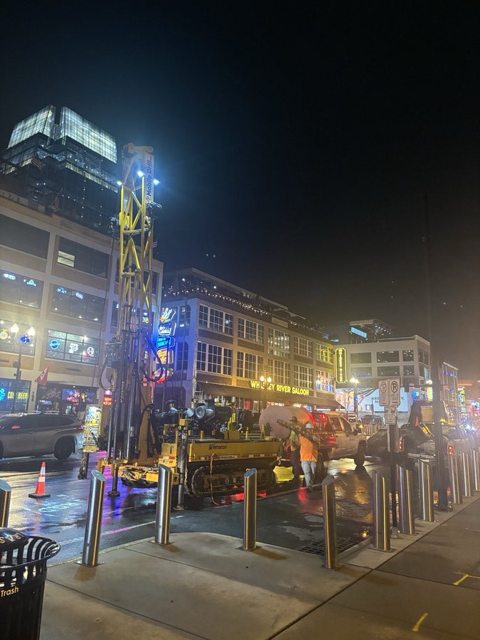 Las primeras perforaciones se realizaron a inicios de octubre en las intersecciones de First & Broadway y Fourth & Broadway, ubicaciones emblemáticas cercanas al histórico Riverfront Park y al icónico Tootsie’s, en pleno corazón de la famosa Honky-Tonk Highway. Posteriormente, el 10 de octubre, se iniciaron trabajos similares en las cercanías de la Universidad de Vanderbilt.