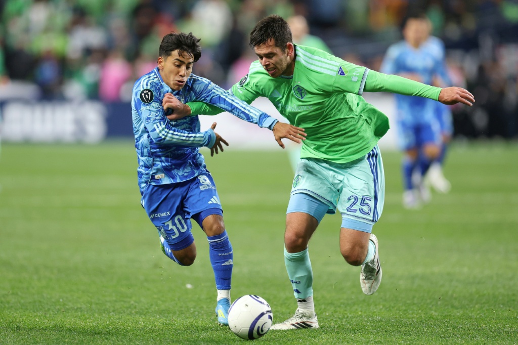 Los futbolista de Tigres Diego Sánchez (izq.) y Seattle Sounders Jackson Ragen, en acción en la segunda parte de su partido de vuelta de cuartos de final de la Copa de Campeones de la Concacaf, en Seattle (Washington, EEUU), el 15 de abril de 2026