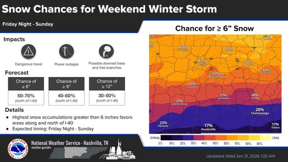 Nashville, Tennessee.- Se ha emitido una Vigilancia de Tormenta Invernal desde la noche del viernes hasta el domingo, ya que una tormenta invernal importante podría afectar la región.