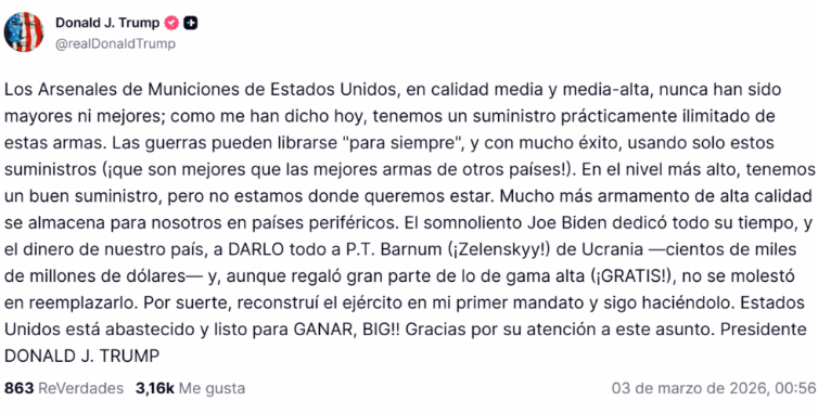 Washington, DC.- El presidente de Estados Unidos, Donald Trump, utilizó su plataforma propia de redes sociales, Truth Social, para afirmar que su país posee suministros armamentísticos “prácticamente ilimitados” y que las guerras podrían librarse “eternamente” y con éxito utilizando solo estos recursos.