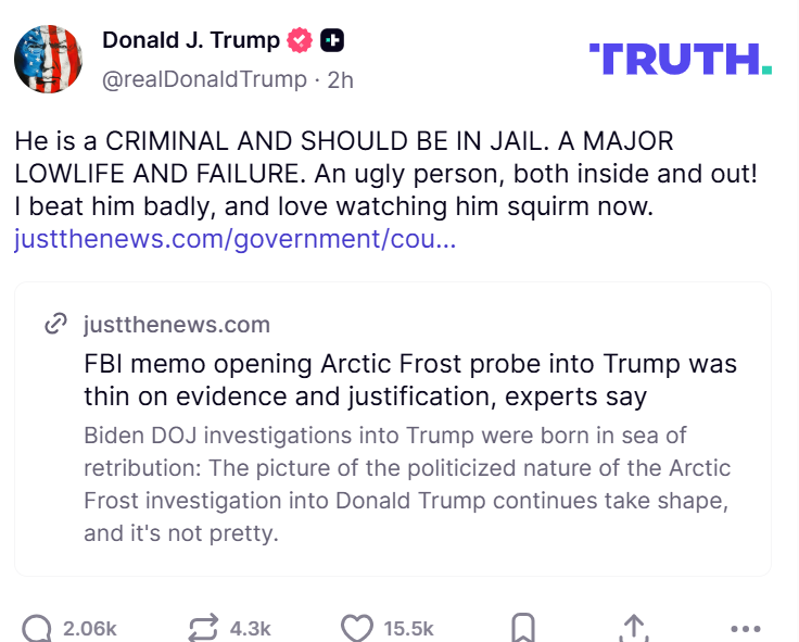 En un mensaje a través de su red social Truth Social, Trump compartió  un artículo acompañado de una descarga contra Biden donde consideró que su antecesor “Es un CRIMINAL Y DEBERÍA ESTAR EN LA CÁRCEL. UN GRAN FRACASO Y FRACASO”.