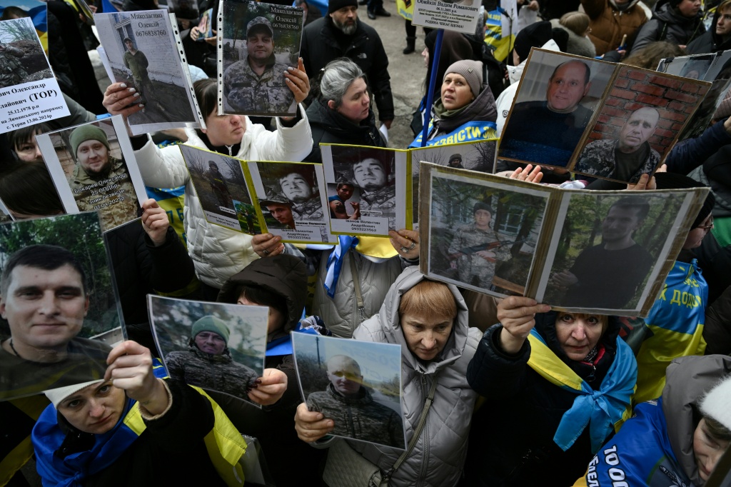 Familiares y amigos de prisioneros de guerra muestran retratos mientras esperan a un grupo de liberados por Rusia el 5 de marzo de 2026 en la región de Chernigiv