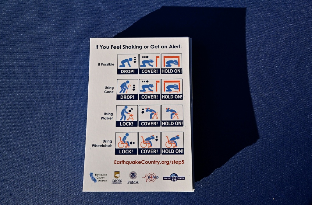 Información sobre cómo actuar en caso de seísmo, preparada por el Simulador de Terremotos de los Servicios de Emergencias de la Oficina del gobernador de California, fotografiada el 15 de octubre de 2025 en la Universidad Estatal, en Fullerton (EEUU)