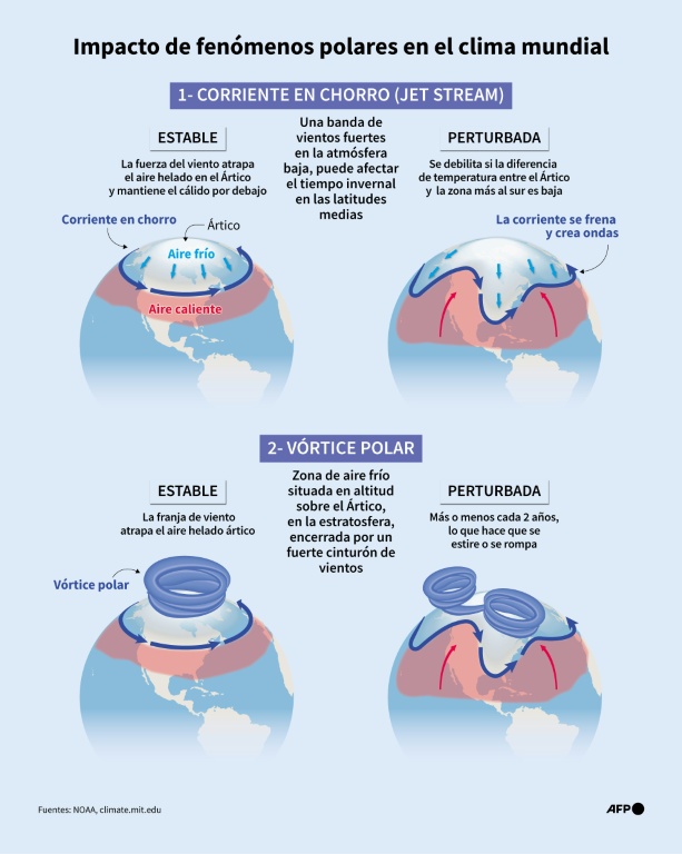 Esto podría deberse a que el Ártico se está calentando a un ritmo superior al promedio mundial, un calentamiento desigual que, según algunos científicos, contribuye a que el vórtice polar se extienda sobre América del Norte.