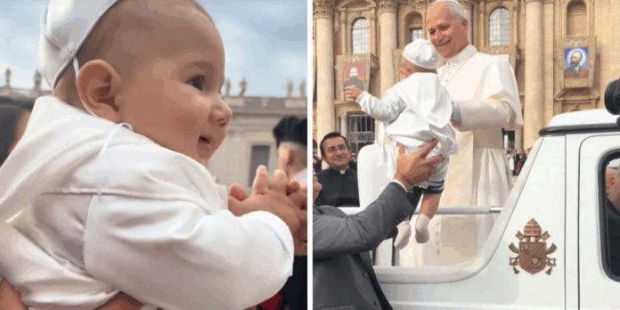 En redes sociales se hizo viral el tierno momento en el que un bebé, vestido de Papa, fue bendecido por León XIV.