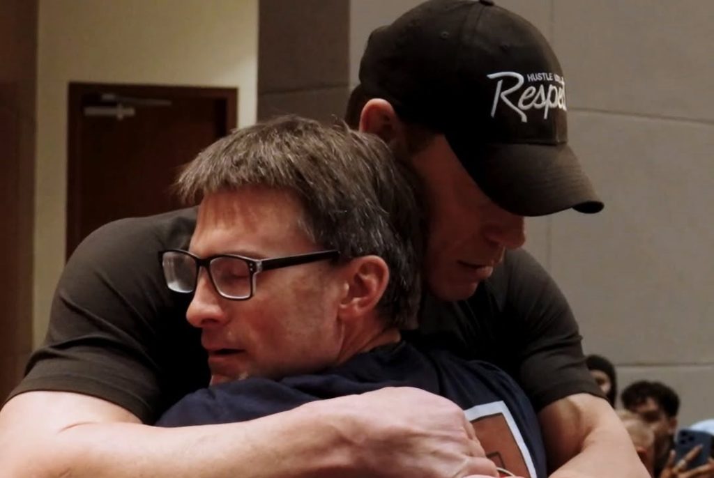 De inmediato, el exluchador bajó del escenario y abrazó al joven de forma prolongada, desatando una gran ovación entre los presentes.